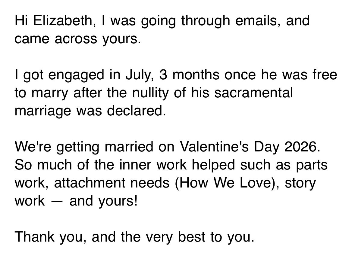Very quickly into our work (the second week!) a man entered my life that was everything on my list, but even better. Without Elizabeth’s work, I likely would have behaved in my typical anxious avoidant ways and harmed the budding relationship.